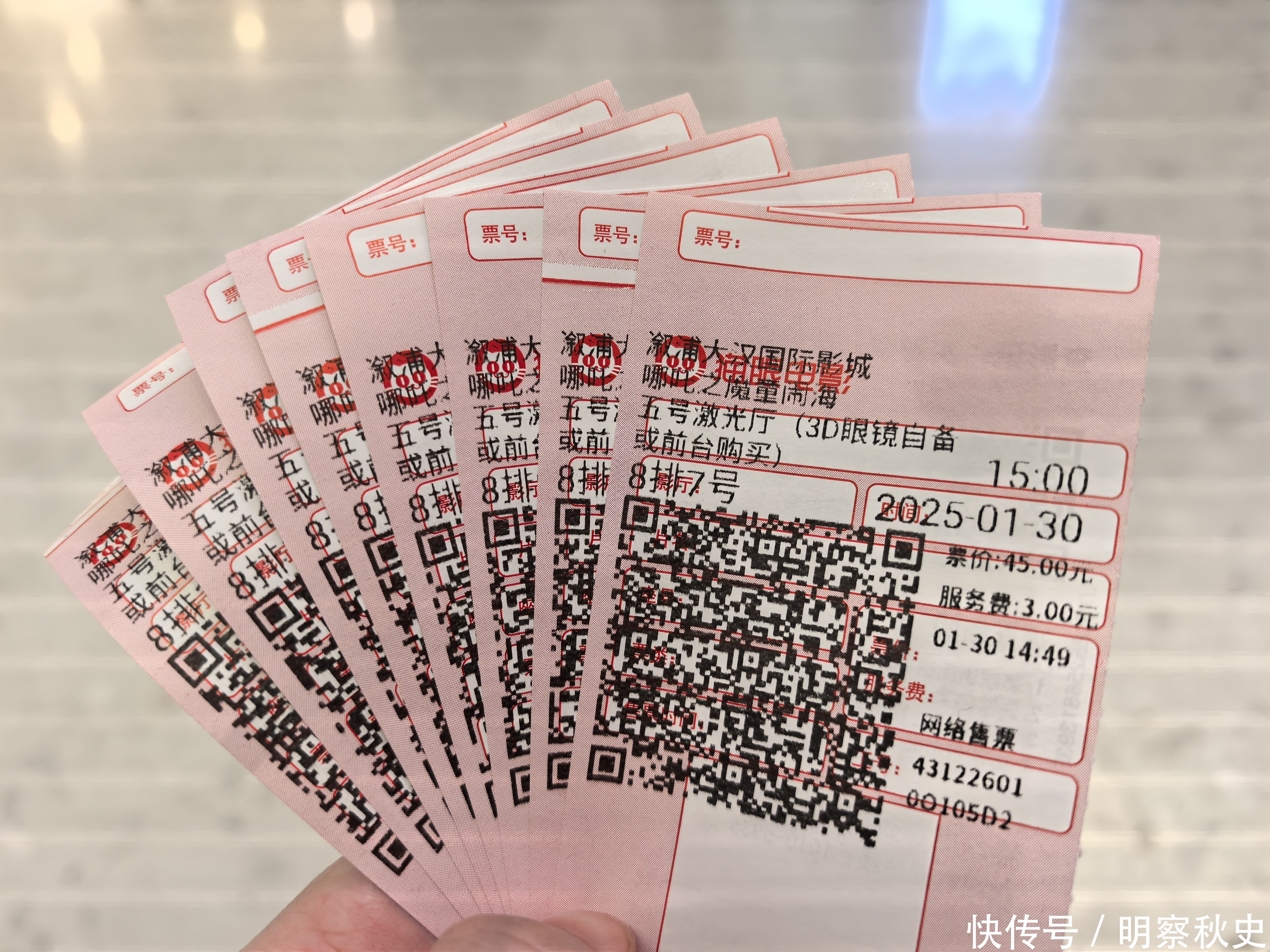 春节技巧,电影商场握续火爆,票价也成了热点话题,来自怀化溆浦的罗女士,春节技巧邀请家里东谈主看电影,连结买了十张票,诚然提前了一天购买,票面价钱为45元,还需要3元办事费,十东谈主票价快要500元。“县城惟有三个电影院,这个还算低廉的,还有53元一张票的。”