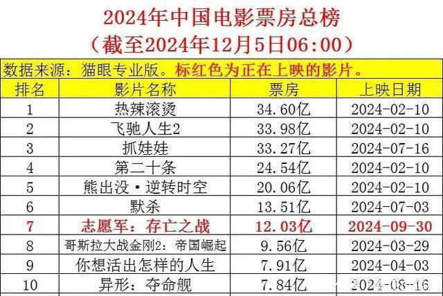 2024年来到了尾声,本年的电影票房排行就基本上不错宣告尘埃落定。结果目前,中国电影票房榜排行前十如下图