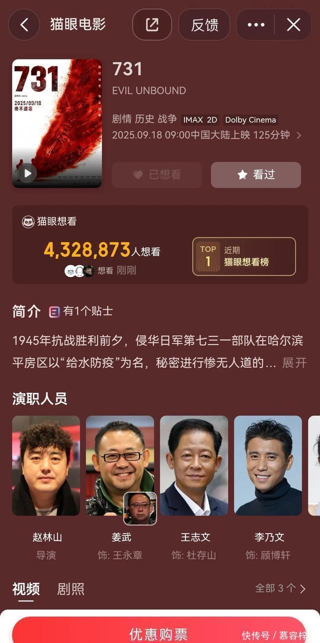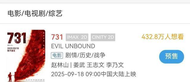 9月4日,万众期待的电影《731》已厚爱刊行并开启预售,音信一公布就一忽儿点火了电影商场。仅一小时,排片打破3万场,占比高达99.7%,不到半天,预售票房直破百万。猫眼平台“思看”东谈主数已超430万,强势登顶榜单第一。由赵林山捏导,姜武、王志文、李乃文等一众实力演员倾力出演的这部影片,定档9月18日上映,无疑成为本年最受眷注的国产电影之一。