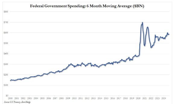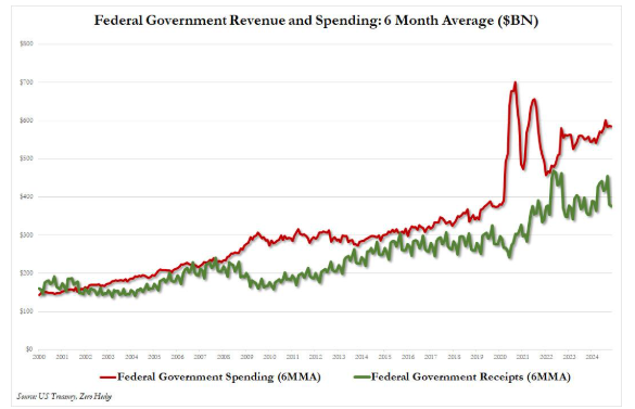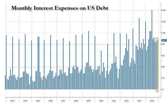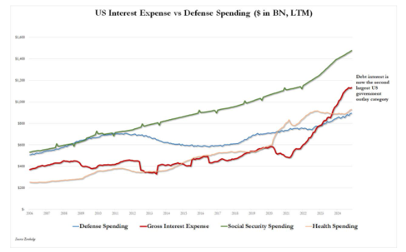 有关词,不要指望利息支拨的利率下跌会捏续下去,因为尽管好意思联储自9月以来仍是两次降息, 但这已被债务激增所对消。好意思国债务总和已达36.2万亿好意思元,比一个月前加多了5万亿好意思元,除非马斯克指引的政府后果部(DOGE)设法以某种面貌削减数万亿的支拨和利息,不然好意思国债务异日几年只会激增,这些债务的利息支拨将很快成为好意思国政府最大的单一支拨类别。