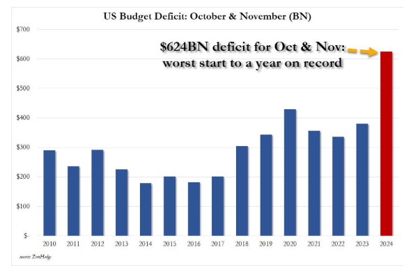 也即是说,从赤字的角度来看,2025财年的前两个月的预算赤字是好意思国财政部有记录以来最灾祸的新财年开局。