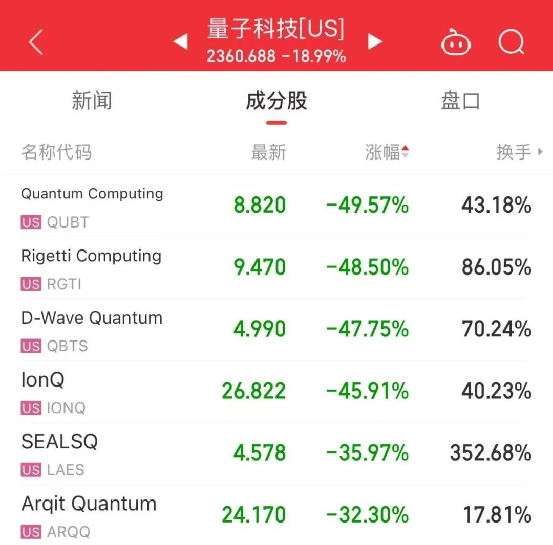 为止收盘,Quantum Computing跌超43%,Rigetti Computing跌超45%,IonQ下降普及38%,D-Wave Quantum跌超36%。