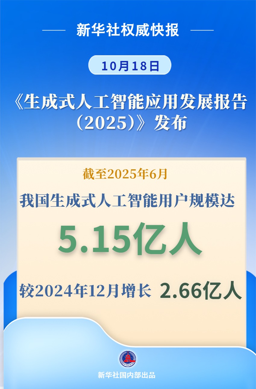 10月18日,中国互联网罗信息中心在2025(第六届)中国互联网基础资源大会上发布《生成式东谈主工智能哄骗发展呈文(2025)》。呈文知道,适度2025年6月,我国生成式东谈主工智能用户限制达5.15亿东谈主,较2024年12月增长2.66亿东谈主,用户限制半年翻番;扶助率为36.5%。